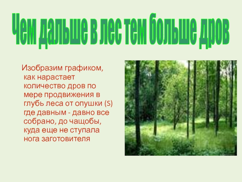 продвижения в глубь леса от опушки (S) где давным - давно все собрано, до чащобы, куда еще не ступала нога заготовителя
