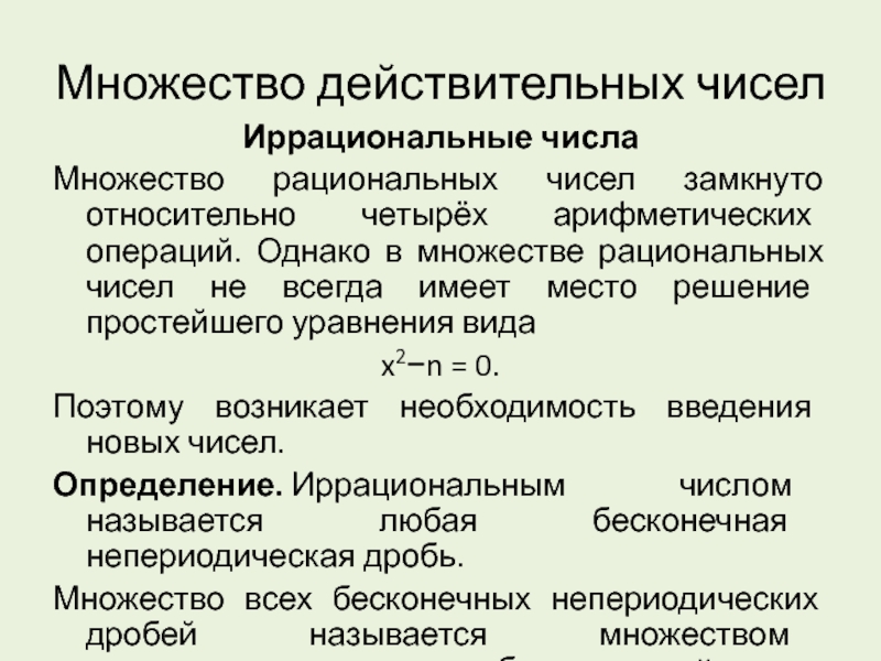 Определение. Иррациональным числом называется любая бесконечная непериодическая дробь.