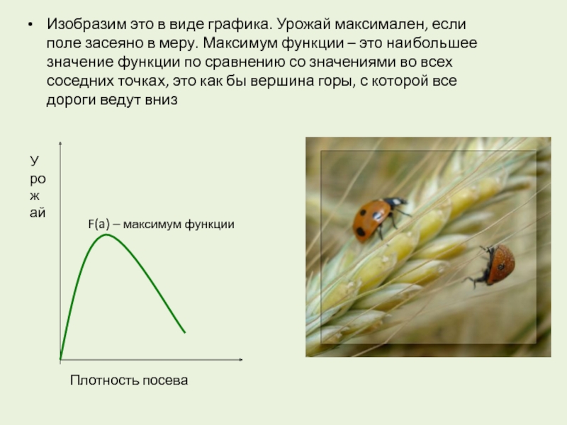 Слайд 26Изобразим это в виде графика. Урожай максимален, если поле засеяно в