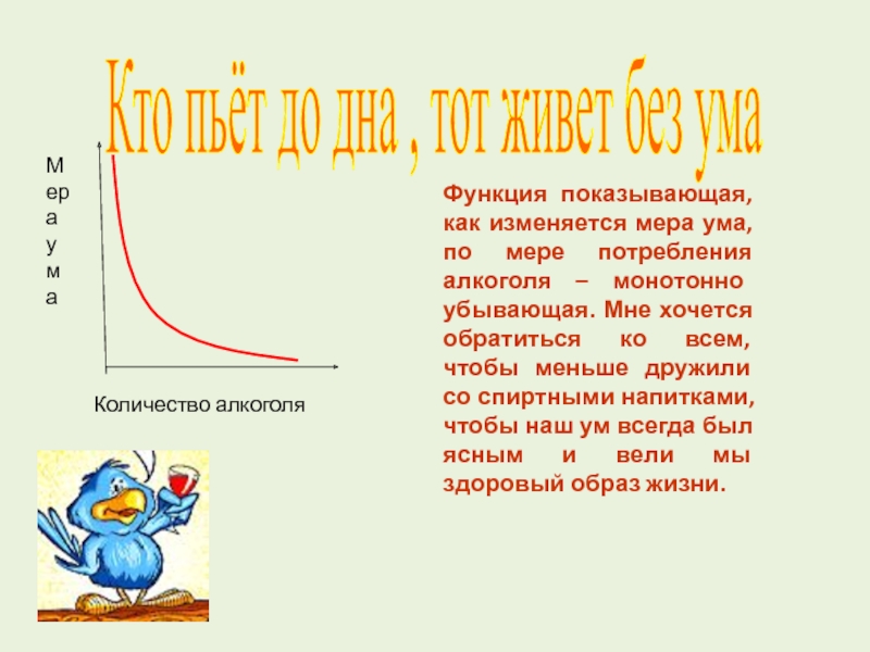 Функция показывающая, как изменяется мера ума, по мере потребления алкоголя – монотонно убывающая. Мне хочется обратиться ко всем, чтобы меньше дружили со спиртными напитками, чтобы наш ум всегда был ясным и вели мы здоровый образ жизни.