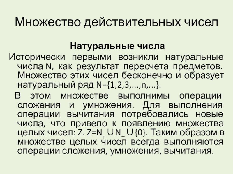 В этом множестве выполнимы операции сложения и умножения. Для выполнения операции вычитания потребовались новые числа, что привело к появлению множества целых чисел: Z. Z=N+∪N−∪{0}. Таким образом в множестве целых чисел всегда выполняются операции сложения, умножения, вычитания.