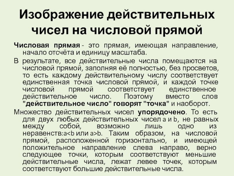 Множество действительных чисел упорядочено. То есть для двух любых действительных чисел a и b, не равных между собой, возможно лишь одно из неравенств:ab. Таким образом, на числовой прямой, расположенной горизонтально, и имеющей положительное направление слева направо, верно следующее точки, которым соответствуют меньшие действительные числа, лежат левее точек, которым соответствуют большие действительные числа.