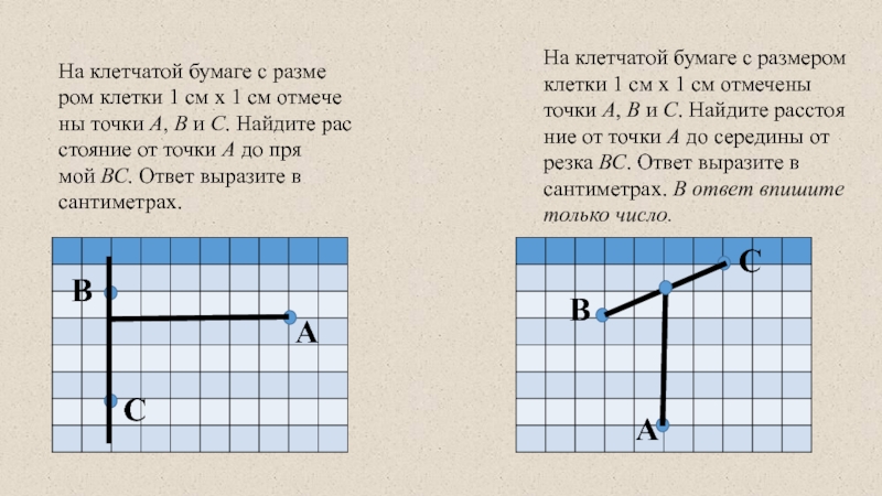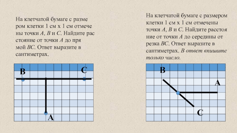 На клетчатой бумаге с размером клетки 1 см x 1 см отмечены точки А, В и С. Найдите расстояние от точки А до середины отрезка ВС. Ответ выразите в сантиметрах. В ответ впишите только число.