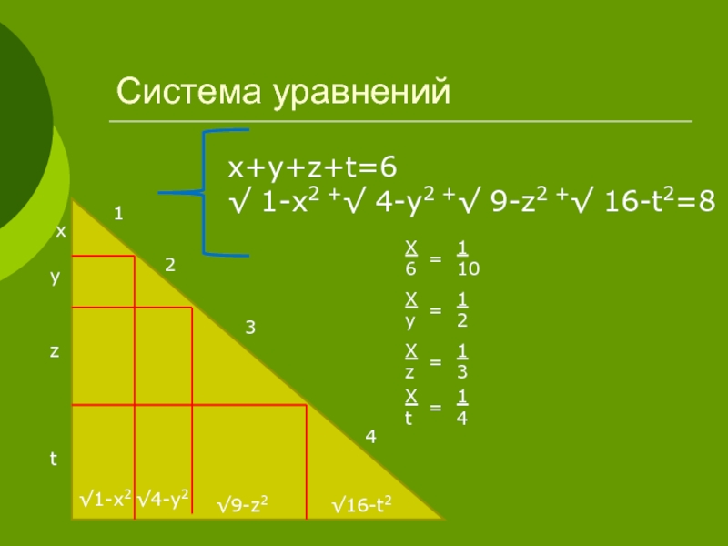 Система уравненийxyzt√1-x2√4-y2√9-z2√16-t21234x+y+z+t=6√ 1-x2 +√ 4-y2 +√ 9-z2 +√ 16-t2=8X6110Xy12Xz13Xt14====
