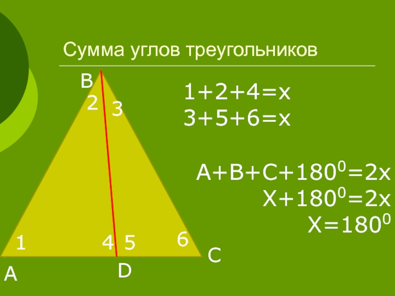 Сумма углов треугольников1234561+2+4=x3+5+6=xABCDA+B+C+1800=2xX+1800=2xX=1800