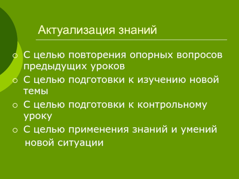 Актуализация знанийС целью повторения опорных вопросов предыдущих уроковС целью подготовки к изучению новой темыС целью подготовки к