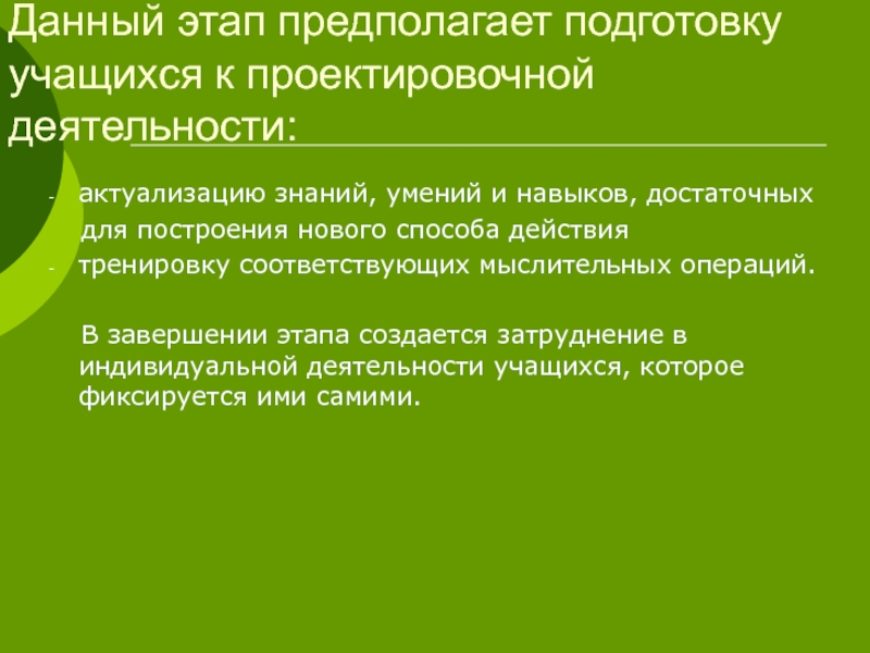 Слайд 3Данный этап предполагает подготовку учащихся к проектировочной деятельности:
