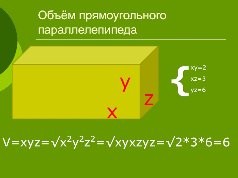 Объём прямоугольного параллелепипедаxyz}xy=2xz=3yz=6V=xyz=√x2y2z2=√xyxzyz=√2*3*6=6