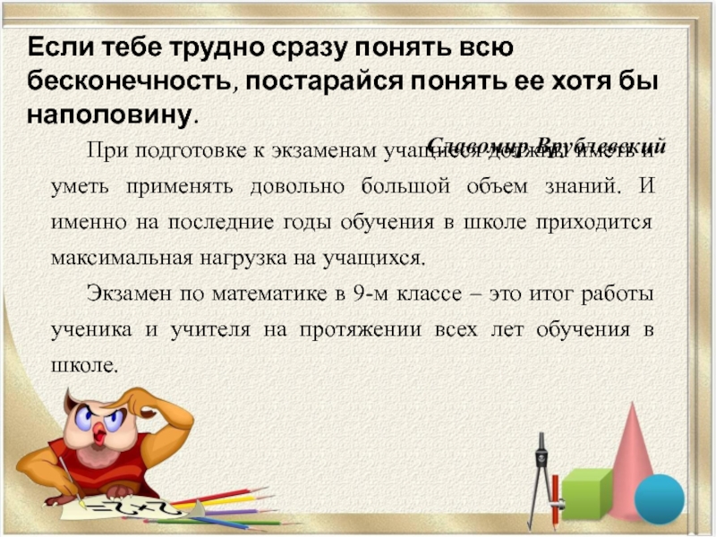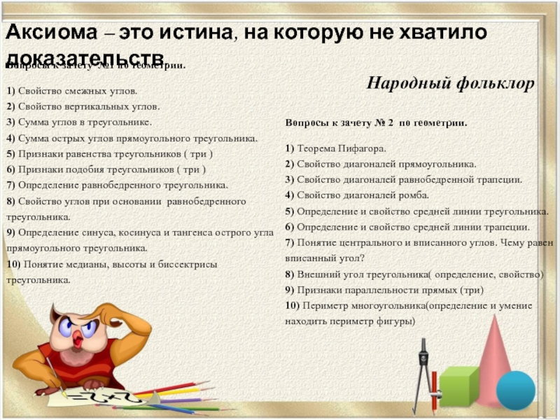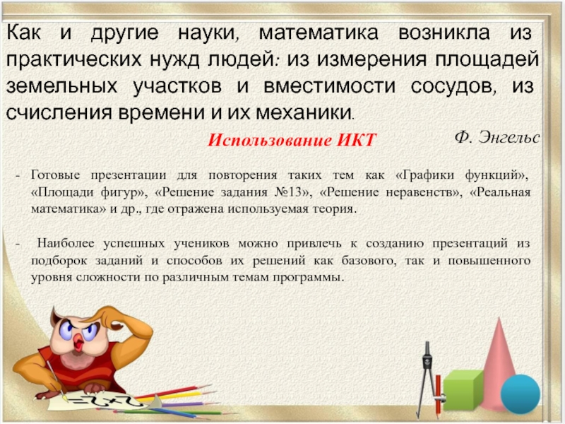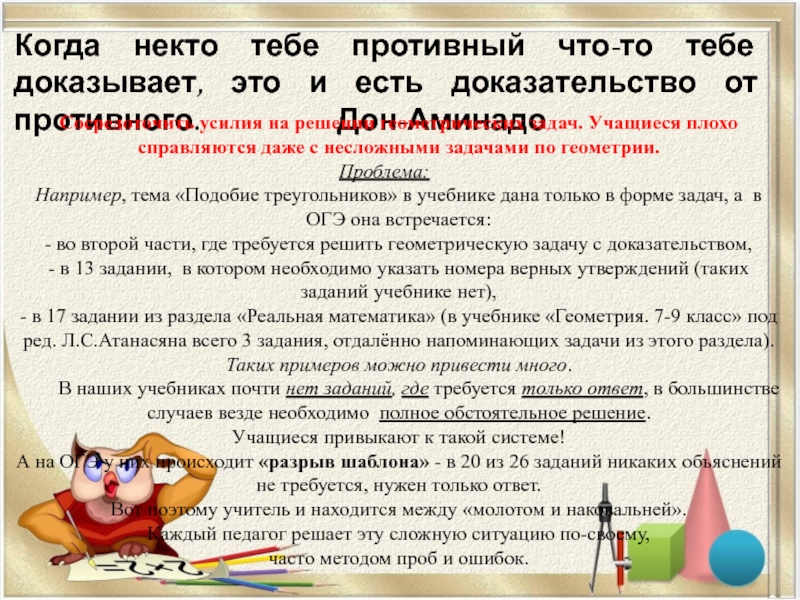 Сосредоточить усилия на решении геометрических задач. Учащиеся плохо справляются даже с несложными задачами по геометрии.