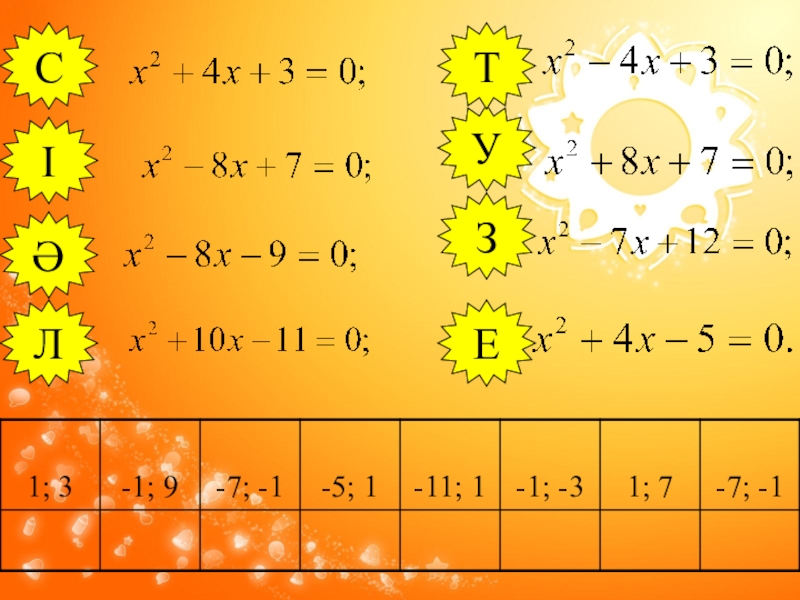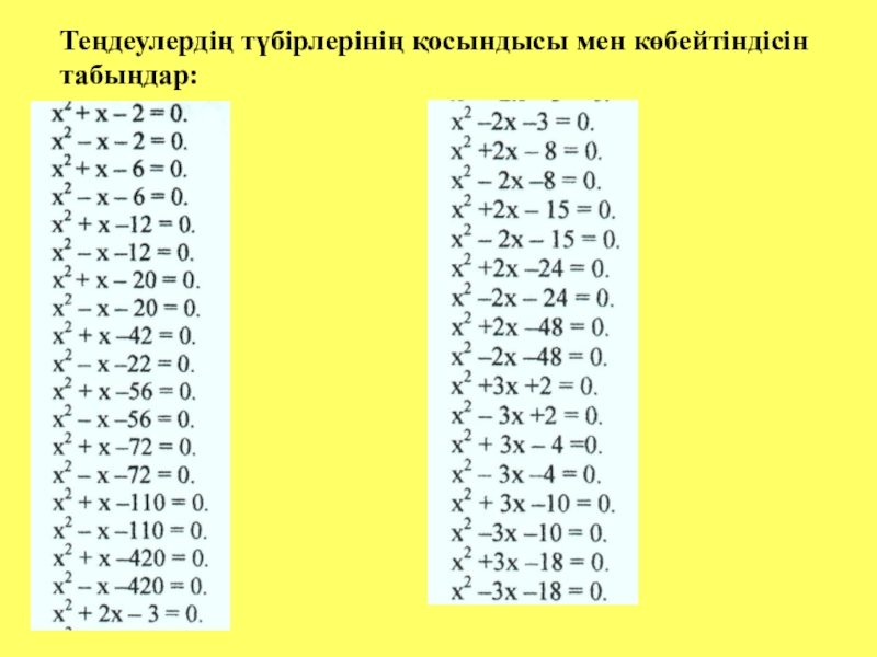 Слайд 9Теңдеулердің түбірлерінің қосындысы мен көбейтіндісін табыңдар: