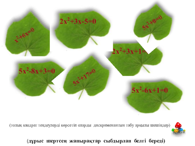 (дұрыс шертсең жапырақтар сыбдырлап белгі береді)(толық квадрат теңдеулерді көрсетіп оларды дискрименантын табу арқылы шешіңдер)
