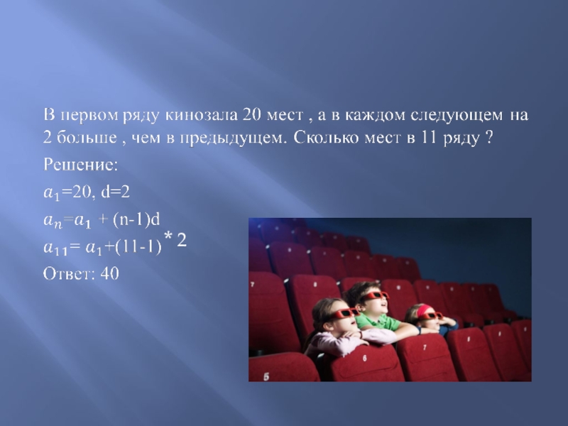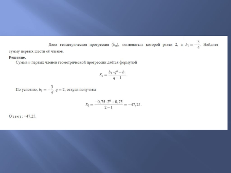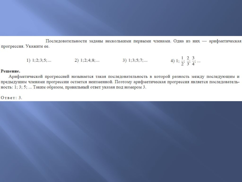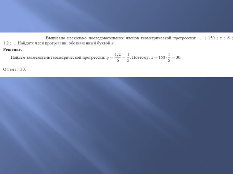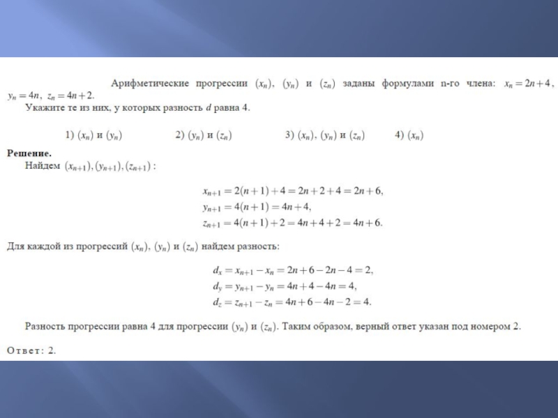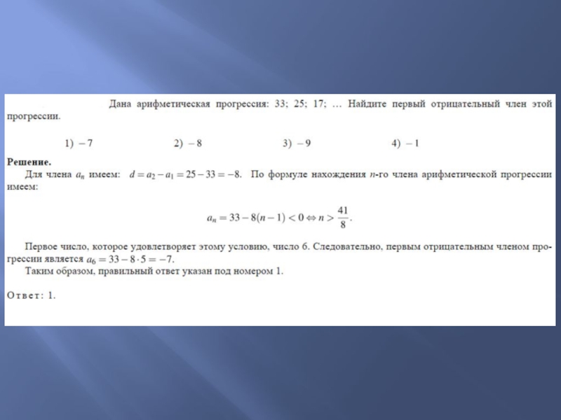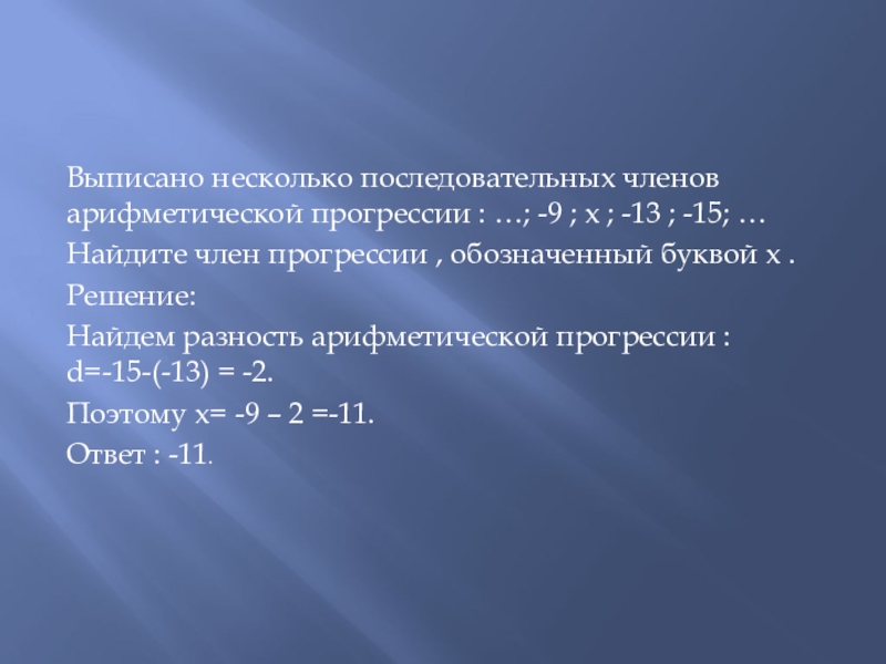Выписано несколько последовательных членов арифметической прогрессии : …; -9 ; x ; -13 ; -15; …Найдите член прогрессии , обозначенный буквой x .Решение:Найдем разность арифметической прогрессии : d=-15-(-13) = -2.Поэтому x= -9 – 2 =-11.Ответ :