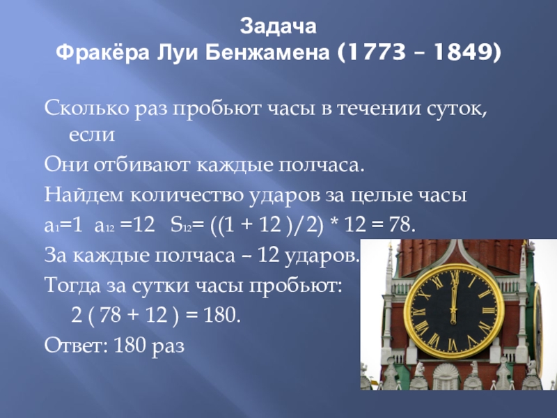 Задача  Фракёра Луи Бенжамена (1773 – 1849) Сколько раз пробьют часы в течении суток, еслиОни отбивают