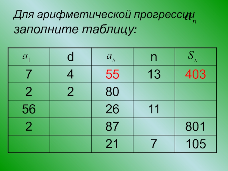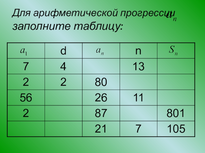 Слайд 11Для арифметической прогрессии заполните таблицу:
