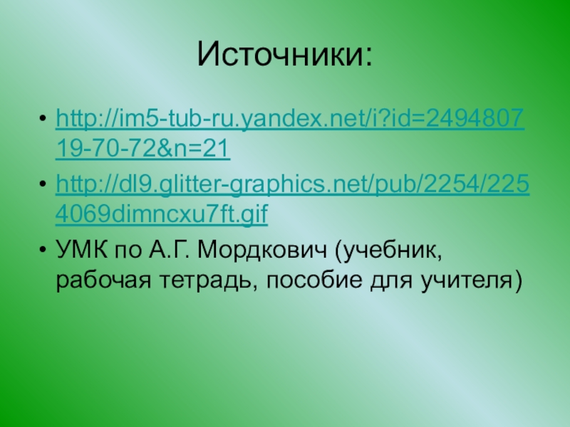 Источники: http://im5-tub-ru.yandex.net/i?id=249480719-70-72&n=21http://dl9.glitter-graphics.net/pub/2254/2254069dimncxu7ft.gifУМК по А.Г. Мордкович (учебник, рабочая тетрадь, пособие для учителя)