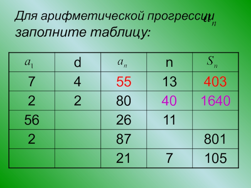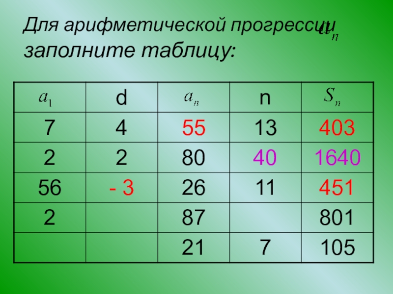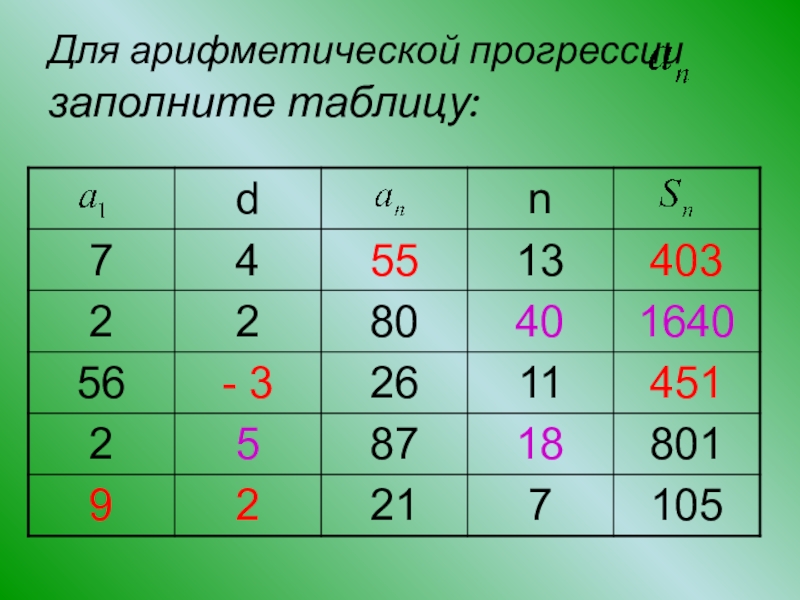 Слайд 7Для арифметической прогрессии заполните таблицу: