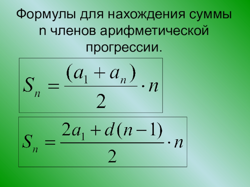 Слайд 2Формулы для нахождения суммы n членов арифметической прогрессии.