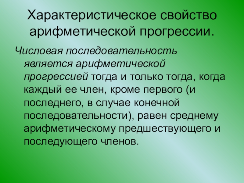 Характеристическое свойство арифметической прогрессии.Числовая последовательность является арифметической прогрессией тогда и только тогда, когда каждый ее член, кроме