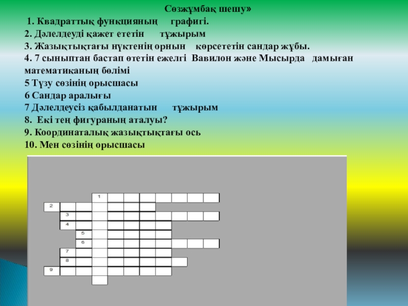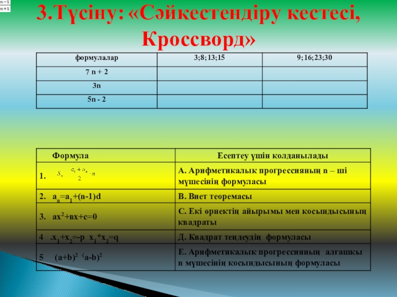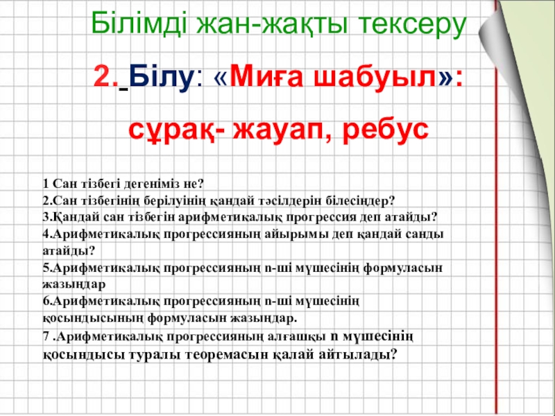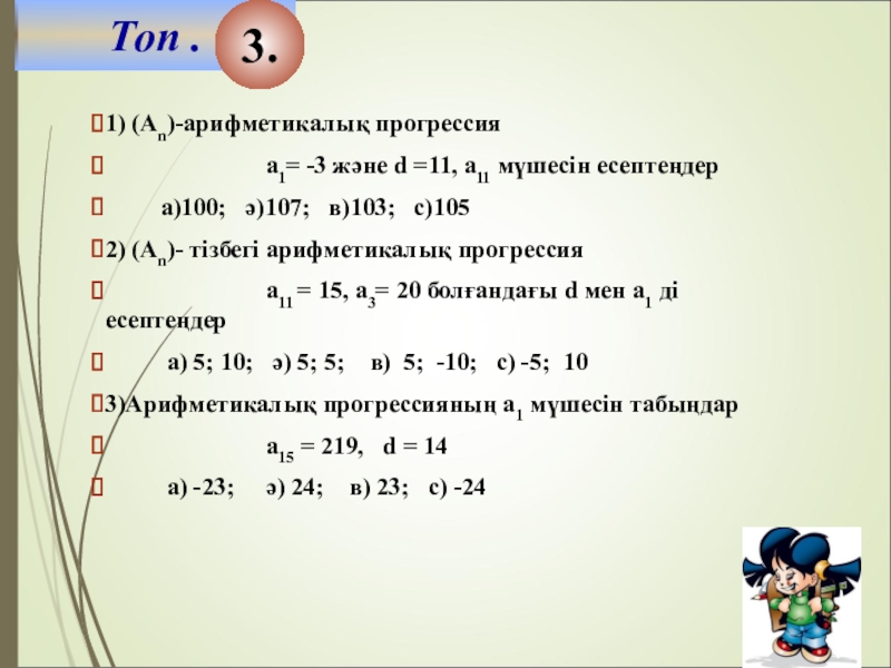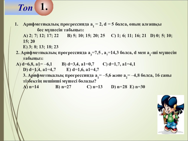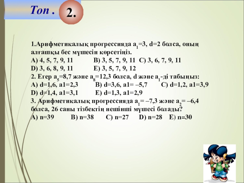 2. Арифметикалық прогрессияда а3=7,5 , а7=14,3 болса, d мен а1-ші мүшесін табыңыз:
