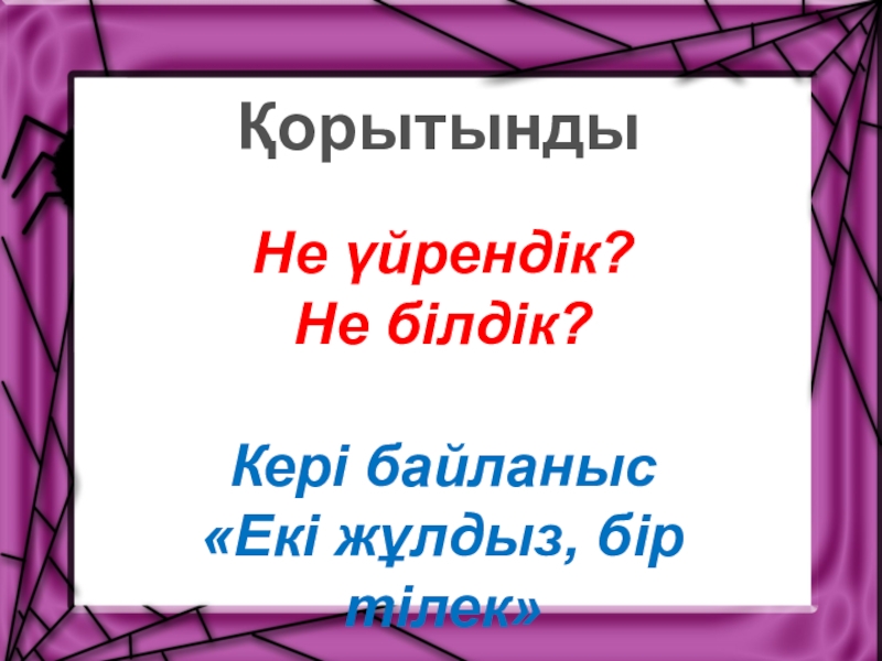 Дәптердің ортасына вертикаль сызық сызу, сызықтың бір жағына тақырып бойынша әсер еткен тұстармен ойларыңды жазыңдар, екніші жағына пікіріңді яғни нені еске түсіретінің себеп салдарын жазыңдар Сол арқылы бүгінгі сабақта не үйренгендерін не білгендерін жинақтайды