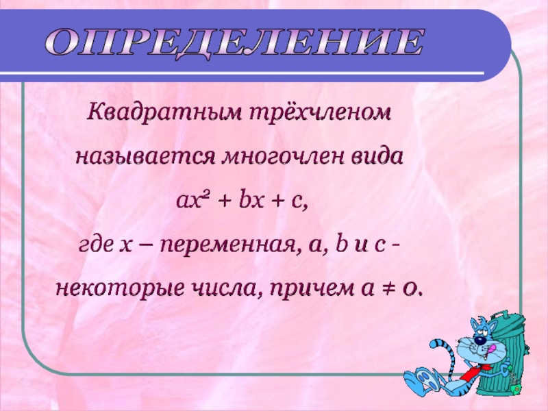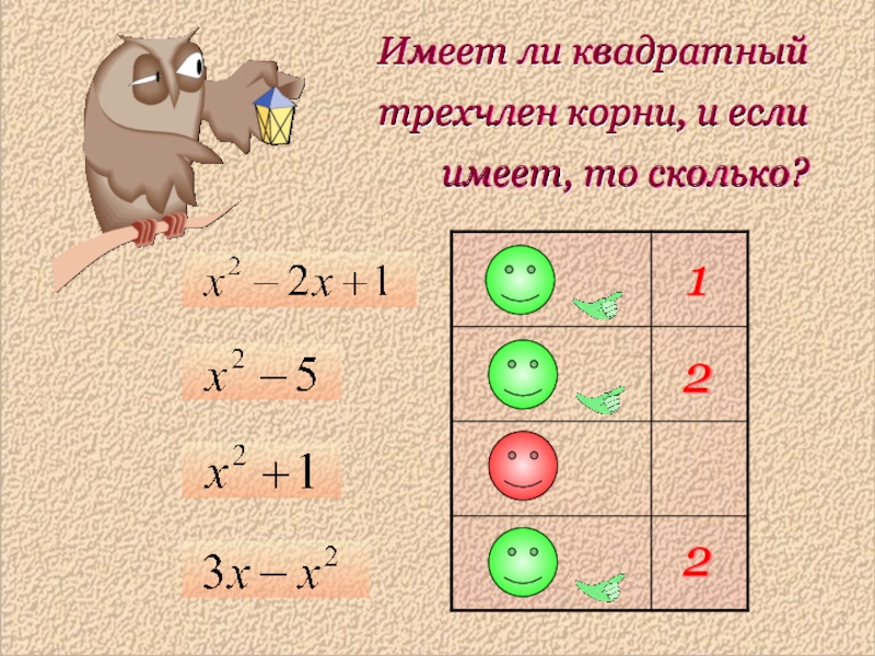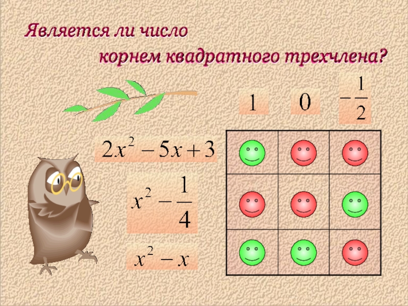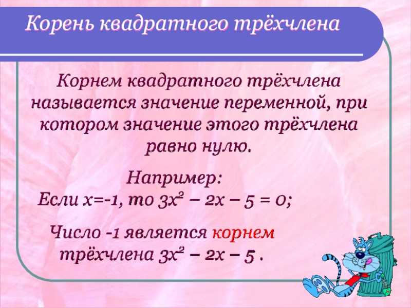 Число -1 является корнем трёхчлена 3x2 – 2x – 5 .