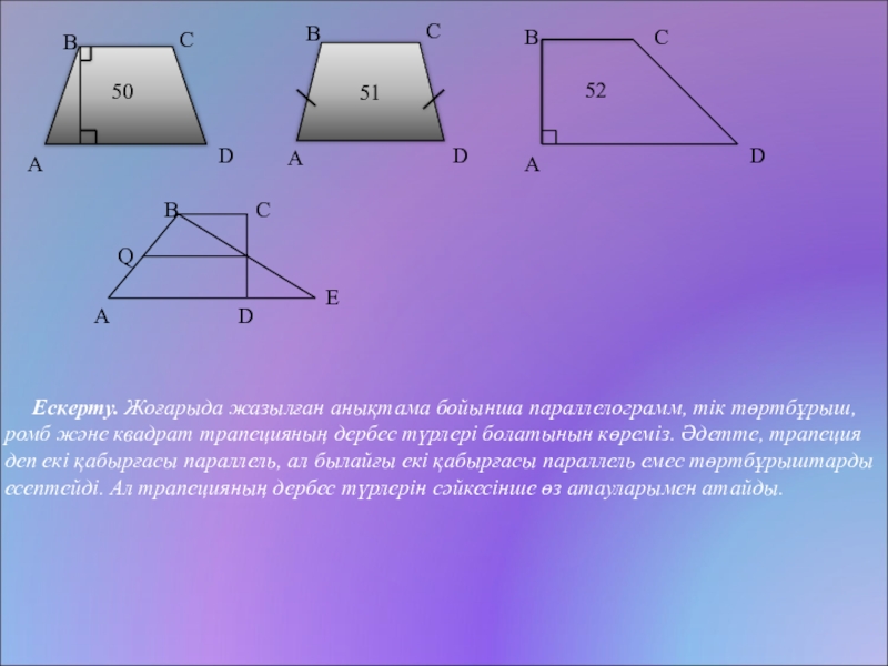 51ABCD5052AQBCDEABCDABCD   Ескерту. Жоғарыда жазылған анықтама бойынша параллелограмм, тік төртбұрыш, ромб және квадрат трапецияның дербес түрлері