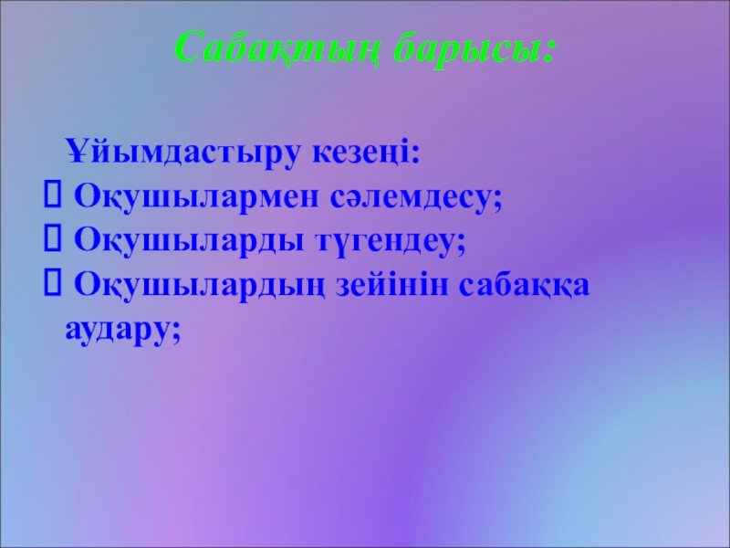 Сабақтың барысы: Ұйымдастыру кезеңі: Оқушылармен сәлемдесу; Оқушыларды түгендеу; Оқушылардың зейінін сабаққа аудару;