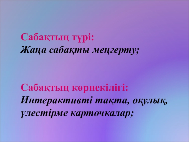 Сабақтың түрі: Жаңа сабақты меңгерту;Сабақтың көрнекілігі: Интерактивті тақта, оқулық, үлестірме карточкалар;