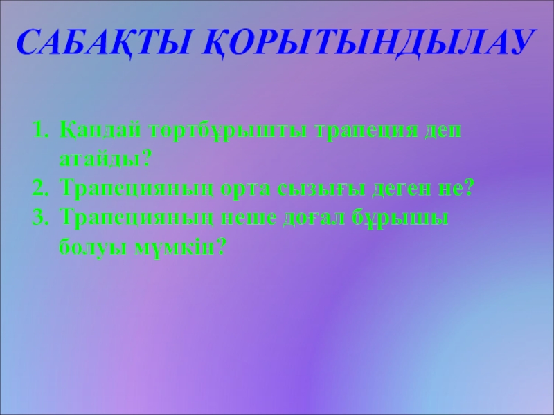 САБАҚТЫ ҚОРЫТЫНДЫЛАУҚандай төртбұрышты трапеция деп атайды?Трапецияның орта сызығы деген не?Трапецияның неше доғал бұрышы болуы мүмкін?