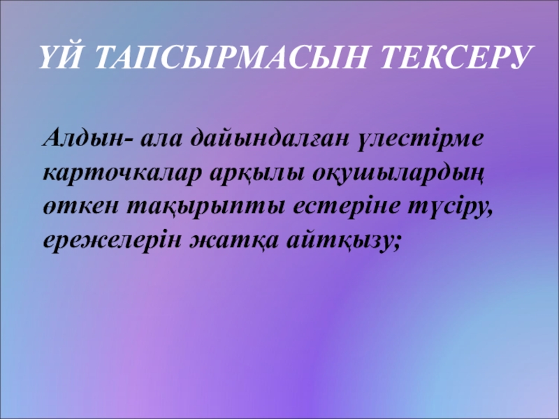 ҮЙ ТАПСЫРМАСЫН ТЕКСЕРУАлдын- ала дайындалған үлестірме карточкалар арқылы оқушылардың өткен тақырыпты естеріне түсіру, ережелерін жатқа айтқызу;