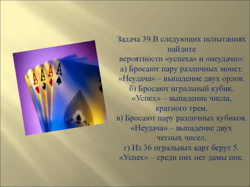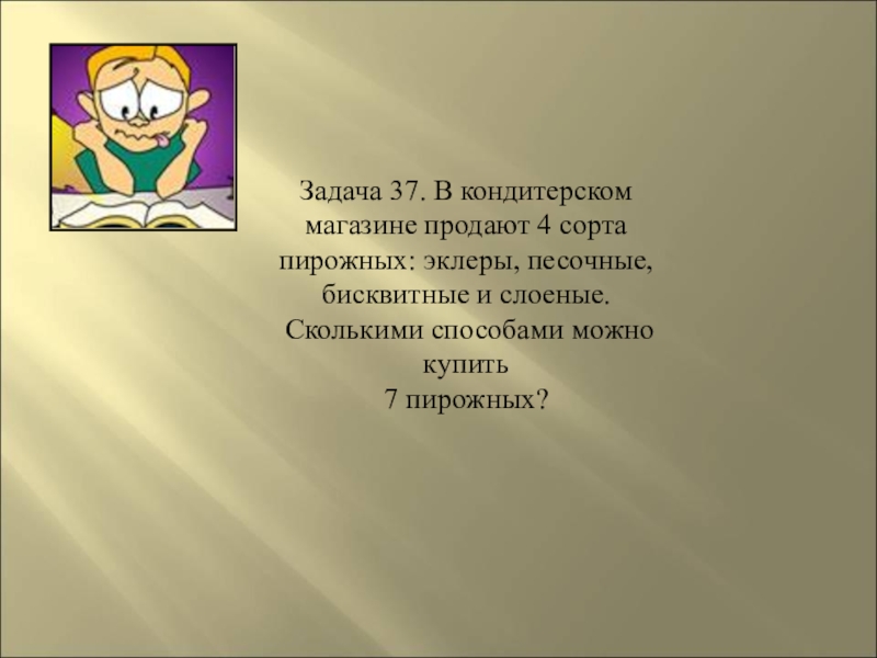 Слайд 239Задача 37. В кондитерском магазине продают 4 сорта пирожных: эклеры, песочные,