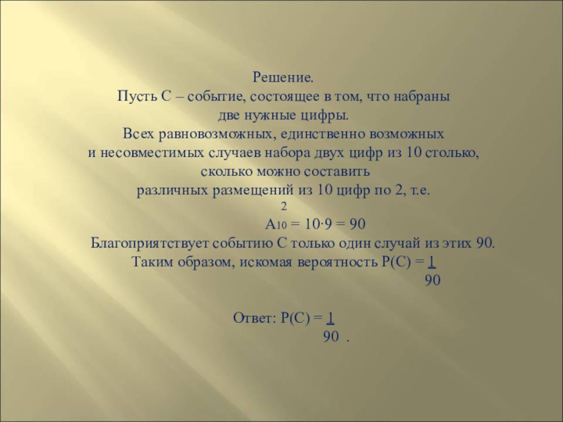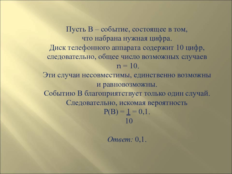 Диск телефонного аппарата содержит 10 цифр, следовательно, общее число возможных случаев