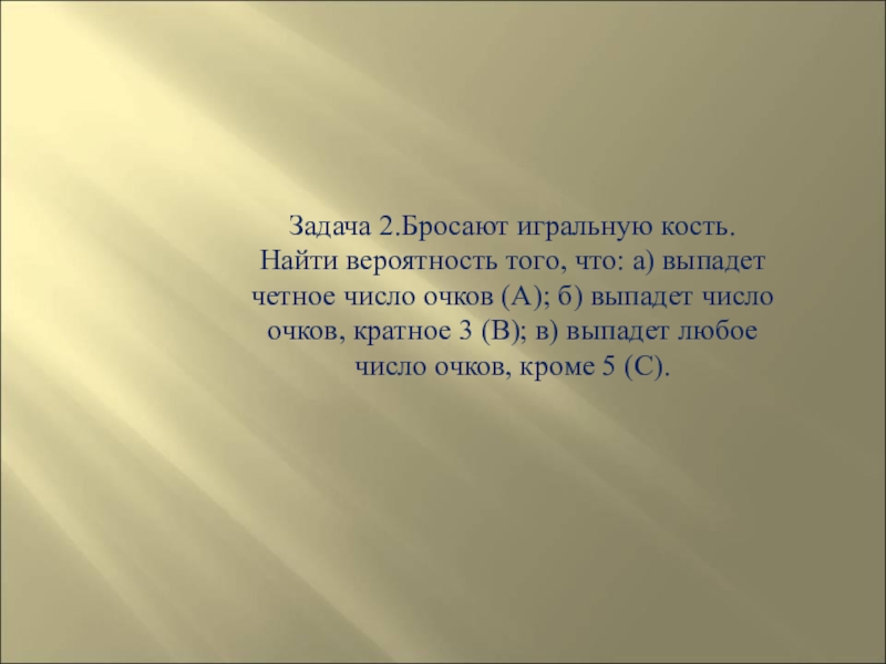 число очков (А); б) выпадет число очков, кратное 3 (В); в) выпадет любое число очков, кроме 5 (С).