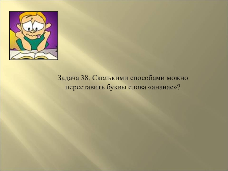 Слайд 241Задача 38. Сколькими способами можно переставить буквы слова «ананас»?