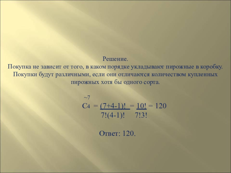коробку. Покупки будут различными, если они отличаются количеством купленных пирожных хотя бы одного сорта.