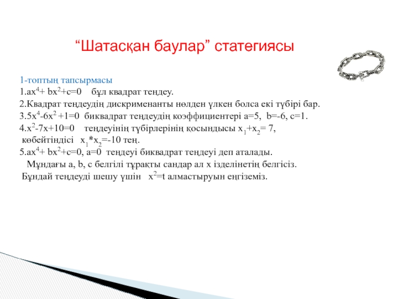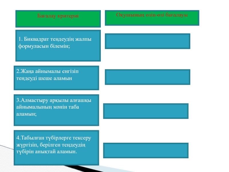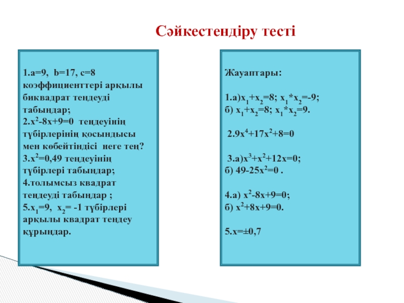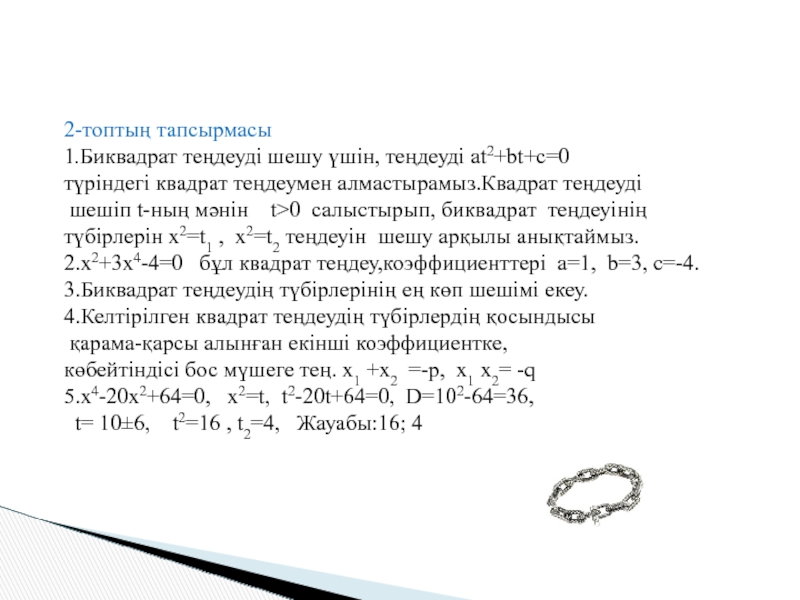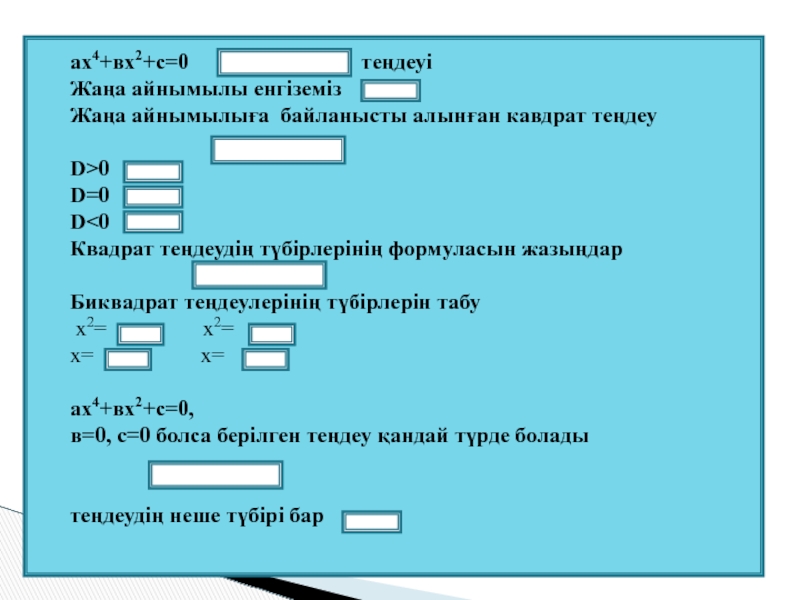 1. Биквадрат теңдеудің жалпы формуласын білемін;
