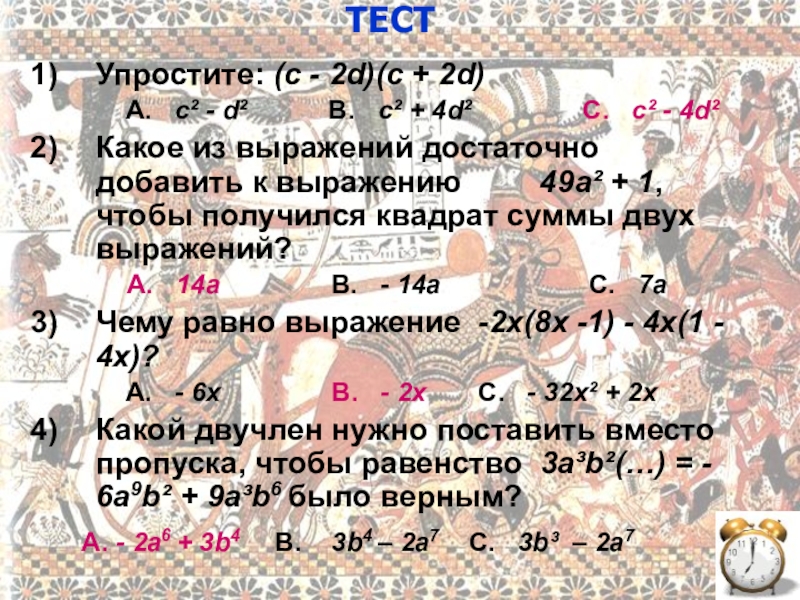 Слайд 21Упростите: (c - 2d)(c + 2d)