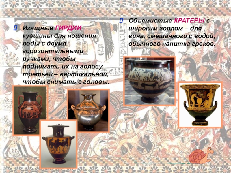 Слайд 9Изящные ГИРДИИ кувшины для ношения воды с двумя горизонтальными ручками, чтобы