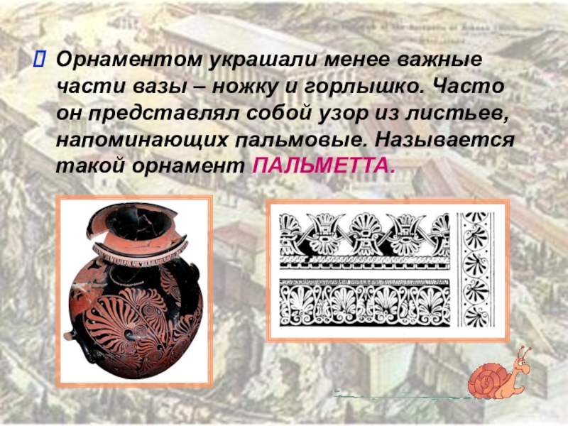 Слайд 13Орнаментом украшали менее важные части вазы – ножку и горлышко. Часто