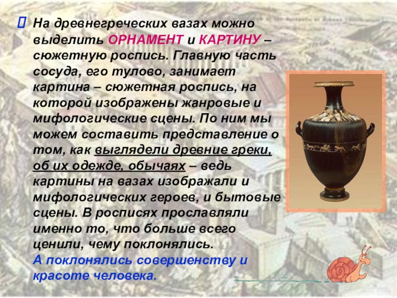 Слайд 12На древнегреческих вазах можно выделить ОРНАМЕНТ и КАРТИНУ – сюжетную роспись.