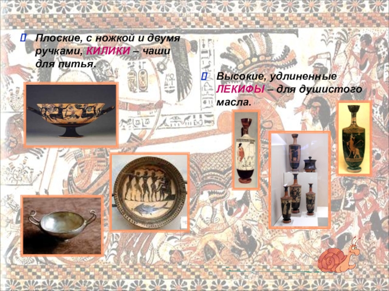 Слайд 10Плоские, с ножкой и двумя ручками, КИЛИКИ – чаши для питья.