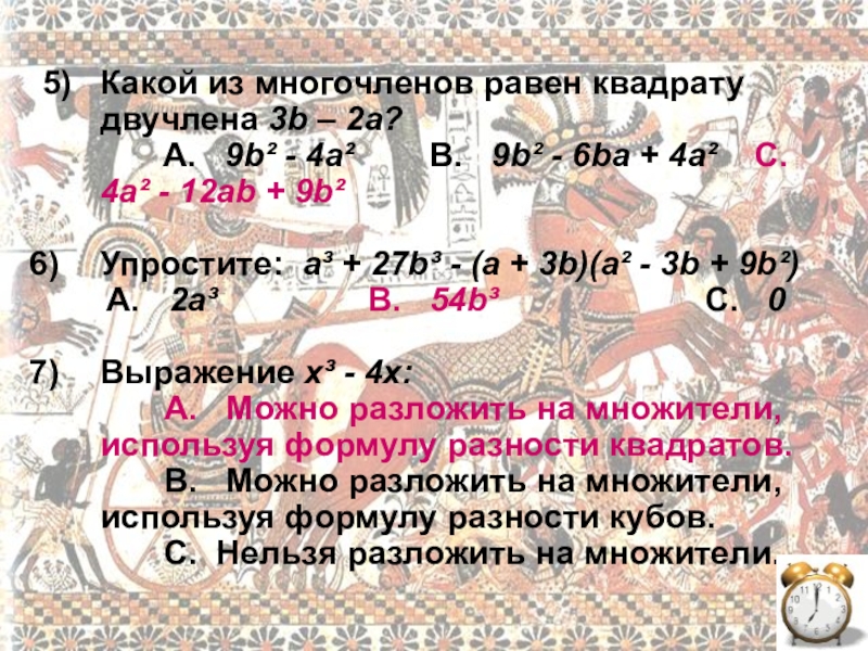 5) Какой из многочленов равен квадрату двучлена 3b – 2a?