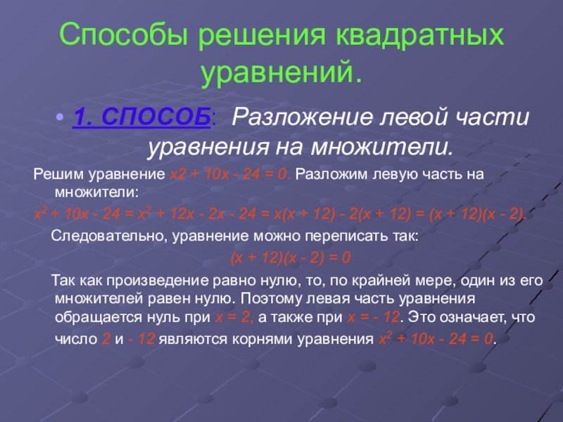 уравнение х2 + 10х - 24 = 0. Разложим левую часть на множители:
