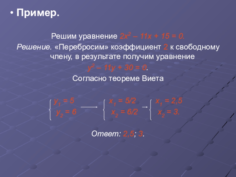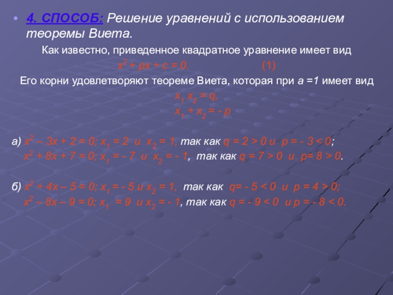Слайд 114. СПОСОБ: Решение уравнений с использованием теоремы Виета.