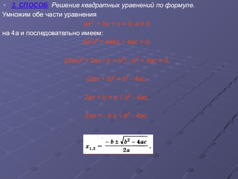 Слайд 103. СПОСОБ: Решение квадратных уравнений по формуле.
