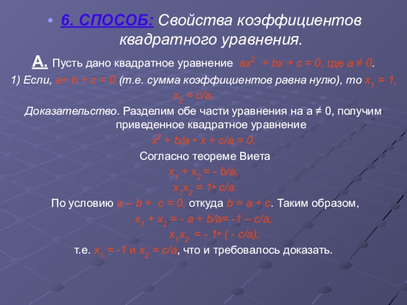 Слайд 146. СПОСОБ: Свойства коэффициентов квадратного уравнения.