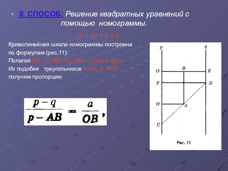 Слайд 209. СПОСОБ: Решение квадратных уравнений с помощью номограммы.