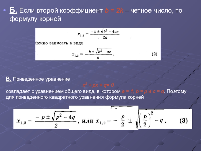 Слайд 15Б. Если второй коэффициент b = 2k – четное число, то