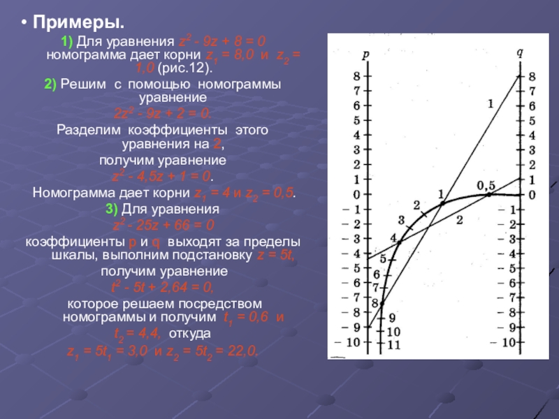 номограмма дает корни z1 = 8,0 и z2 = 1,0 (рис.12).