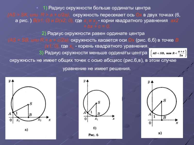 окружность не имеет общих точек с осью абсцисс (рис.6,в), в этом случае уравнение не имеет решения.
